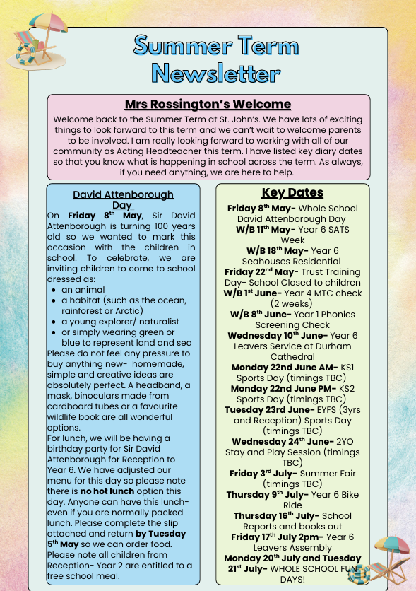 Please find attached our Newsletter which lists key diary dates and information about our David Attenborough Day happening on Friday 8th May in school. Children will be bringing a hard copy home today with a slip to order birthday lunch. Thank you!